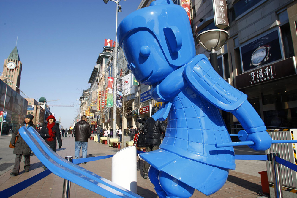 11月17日,在北京王府井大街,一尊將秦俑、公仔、運動、時尚融為一體的「中國特色」雕塑作品「小秦」,吸引了過往遊人。