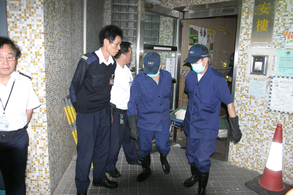 圖:圖為案發當日仵工將一家三口的屍體運走(資料圖片)
