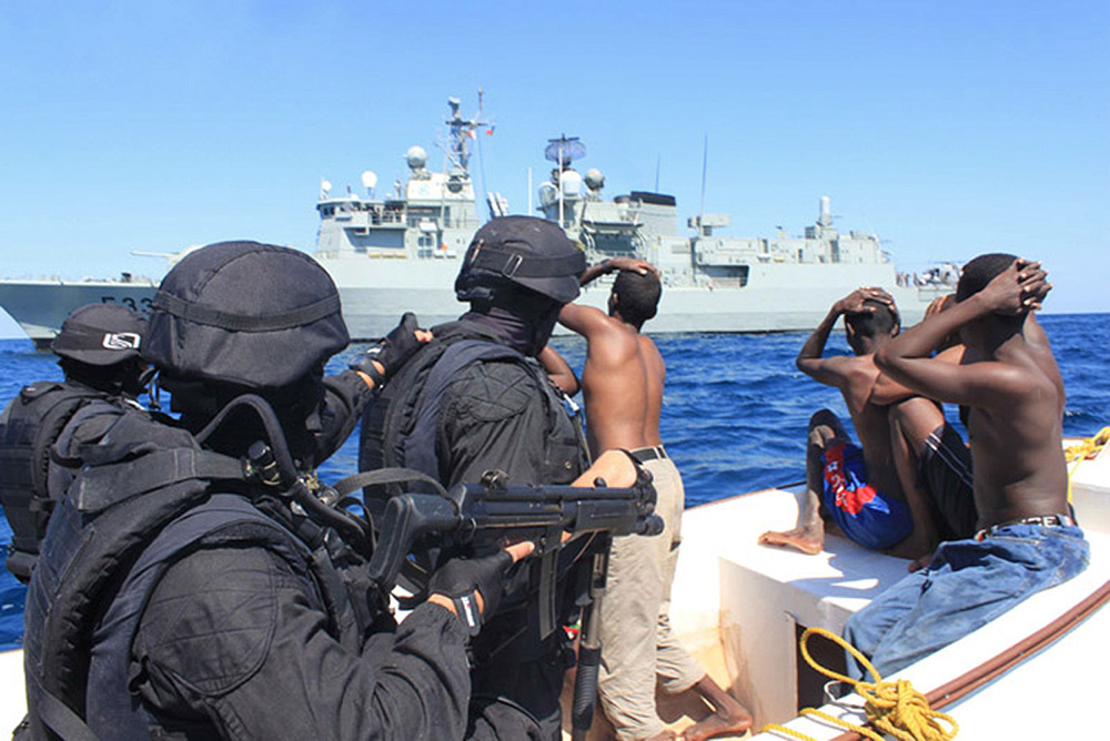 圖:索馬里海盜活動蔓延印度洋,海員代表團體要求船東更顧及海員安危。圖為索馬里海盜向葡萄牙海軍棄械投降情景(法新社)