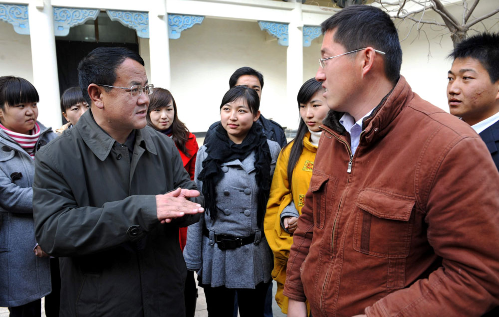 圖:25日,陝西省延安市寶塔區區長闞延軍(前左一)與參加培訓的大學生「村官」們在一起交流。延安市寶塔區將近兩年擔任「村官」的93名大學生進行集中培訓,以加強他們對農村工作的適應能力。這些大學畢業生分別擔任行政村支部書記助理和村主任助理。 (新華社)