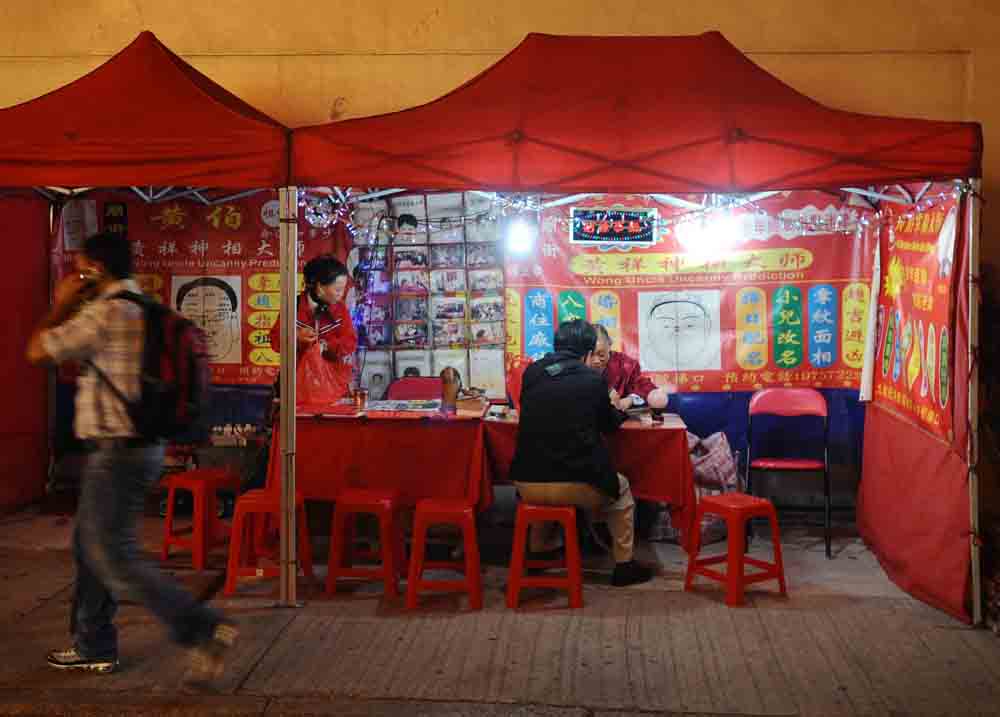 廟街算命,環境雖然簡陋,師傅們架勢都不遑多讓,個個自詡名號「鐵板神算」、「掌相狀元」。為彰顯香港國際大都市風範,不少檔主還能以國語、英語、日語、廣東話算命。且不論命理是否準確,語言功力足成特色,難怪每晚遊人絡繹不絕,成為香港這大都市的市井奇葩。