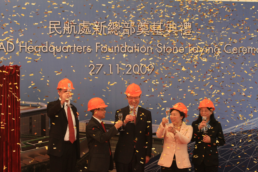圖:唐英年(中)與鄭汝樺(右二)及羅崇文(左二)等主禮嘉賓,主持祝酒儀式,慶祝民航處新總部奠基(本報攝)