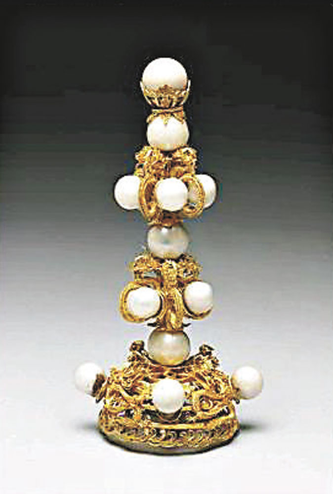 此朝冠頂上面一個大的東珠,中間貫以三層東珠,每層又有四條金龍與四顆東珠相襯。這種禮制為皇帝專有。