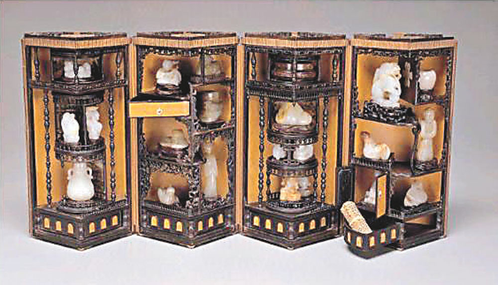 這件多寶格可分為兩部分,上部方匣以一個漢代玉璧為頂蓋,推出四個扇形後,屜格隨之而出。內附各式珍玩。下部正方形底座有扣蓋與上部方匣密合。