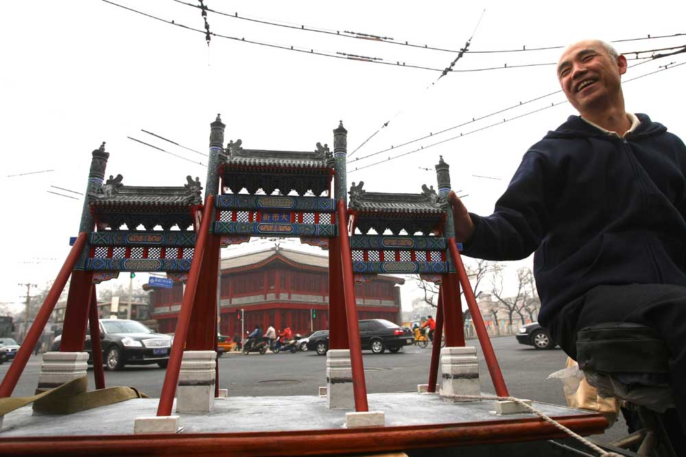 現年59歲的袁益中是全北京為數不多的幾位能製作傳統建築重要部分「枓栱」的人。11月25日,他將精心製作的「西四牌樓」運往北京國際展覽中心。