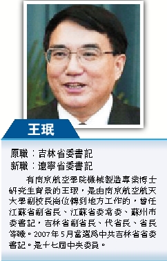 有南京航空學院機械製造專業博士研究生背景的王珉,是由南京航空航天大學副校長崗位轉到地方工作的,曾任江蘇省副省長、江蘇省委常委、蘇州市委書記,吉林省副省長、代省長、省長等職。2007年5月當選為中共吉林省省委書記。是十七屆中央委員。