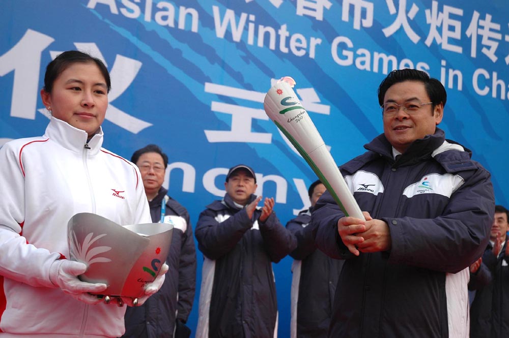 圖:王儒林出任吉林省副省長、代理省長。圖為二○○七年一月,時任亞冬會組委會副主席、中共吉林省委常委、長春市委書記的王儒林(右)點燃第六屆亞洲冬季運動會火炬(中新社)