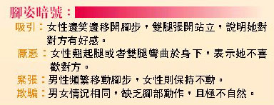 以上這些都是由一名英國主要的心理學家傑夫·畢蒂發現的。他說:「人們可以偽裝笑容,或者假裝眨眼,但是腳的一舉一動卻可以輕易地透露出個人的真實感受,因為人們很少會意識到這一點。」