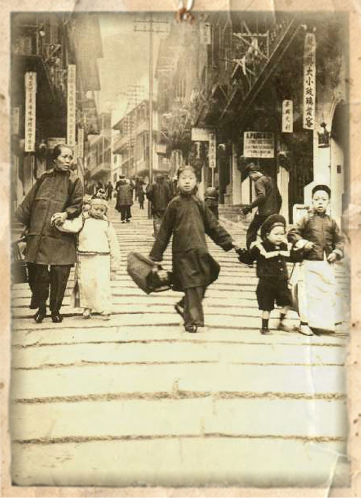 圖:凹凸不平的石地板是砵甸乍街的標誌,今昔不同的是路人的衣着
