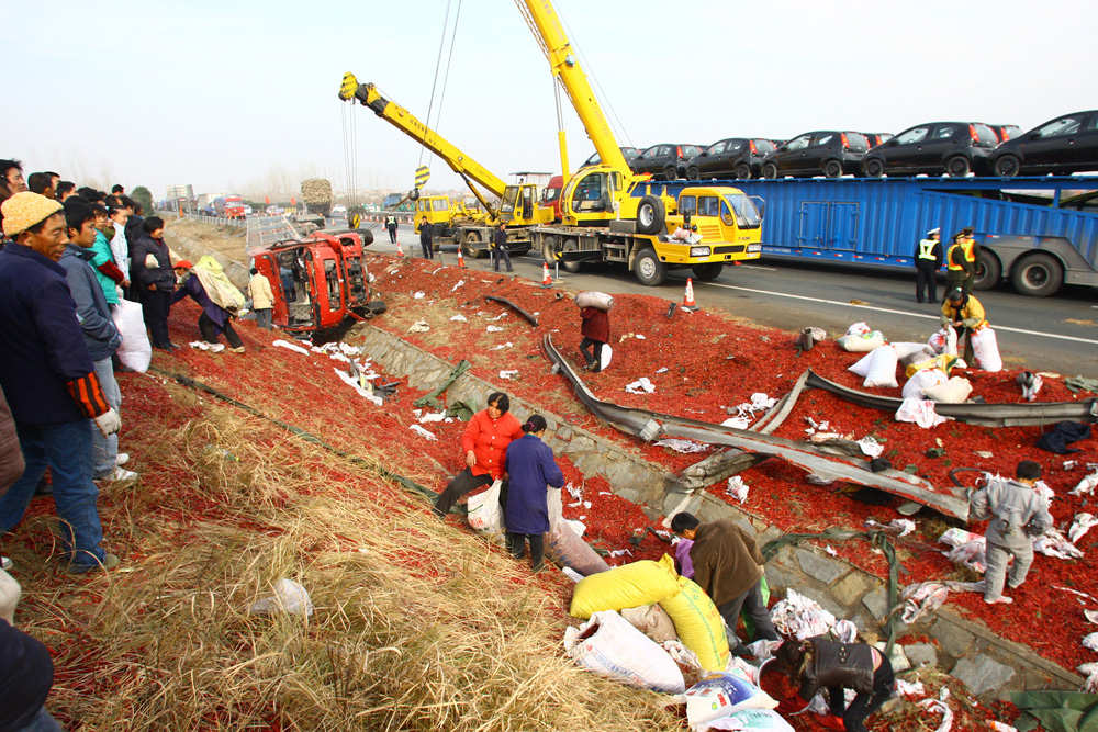 圖:京珠高速湖北段一裝載黑火藥車輛發生爆炸,釀成四死六傷慘劇。圖為被爆炸車輛掀翻的貨車,一袋袋的辣椒散滿草坡(魏錸 攝)