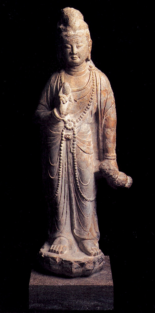 像附圖的石灰岩雕觀音菩薩立像,乃盛唐時代表作,足以窺見唐代石刻與魏晉南北朝時期者截然不同。如北魏石刻,主要用灰石作雕刻材料;其佛像和菩薩像造型衣飾多數簡潔,線條流暢,具有空靈的感覺與開闊的氣勢,但基本上仍屬古印度式的。北魏石刻佛像,與當時「君主為當今如來」的思想息息相關;初唐至盛唐期間,亦不脫這種理念。最大的分別,可說是由魏晉的玄學,轉變為唐代的經學;換言之,乃從虛靈俊逸,趨向豐盈踏實,甚至以「充實為美」。