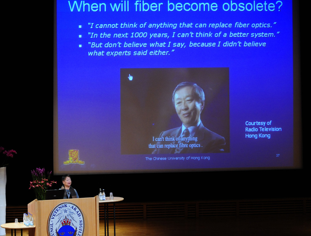 圖:黃美芸在演講過程中,幻燈打出高錕名言:「未來一千年,我想不會有取代光纖的更好系統」(新華社)
