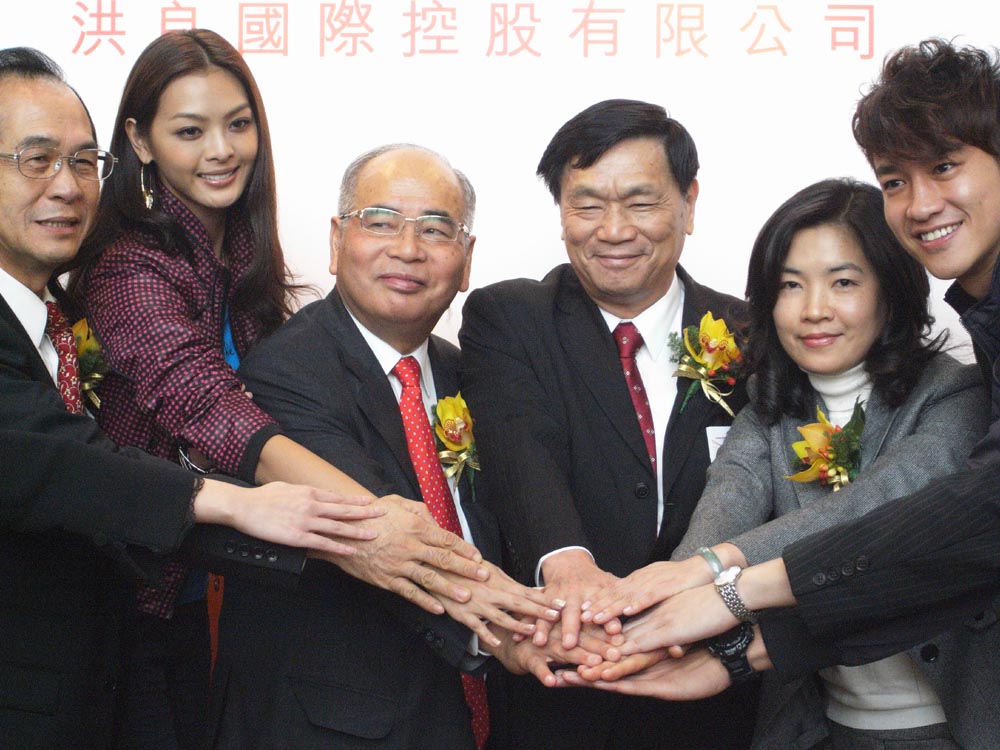圖:洪良國際主席兼執行董事蕭登波(左三)、副主席兼執行董事曾忠正(左四)、行政總裁兼執行董事廖進益(左一)及策略長兼執行董事胡金淑(右二)與藝人推介公司(本報攝)