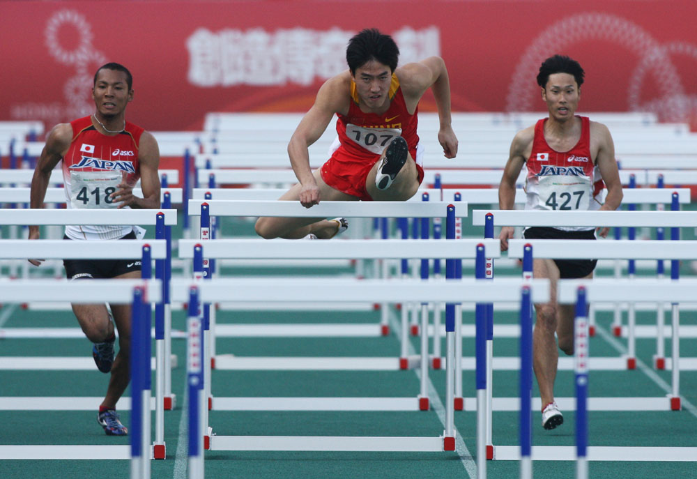 在預賽時半途已開始放慢速度的劉翔,即使在最後十米以近乎緩步跑的速度衝線,仍能以十四秒零二的成績取下小組首名。到昨午的決賽劉翔處於第三道,身旁有韓國名將朴泰硬,隊友紀偉則在第六線,不過二人對劉翔的威脅不算太大,起步後「飛人」已率先帶出,賽程過半已確立領先優勢,到最後十米明顯放慢腳步仍以十三秒六六奪金,紀偉則以十三秒八八摘銀,朴泰硬跑出十四秒零二得銅牌。
