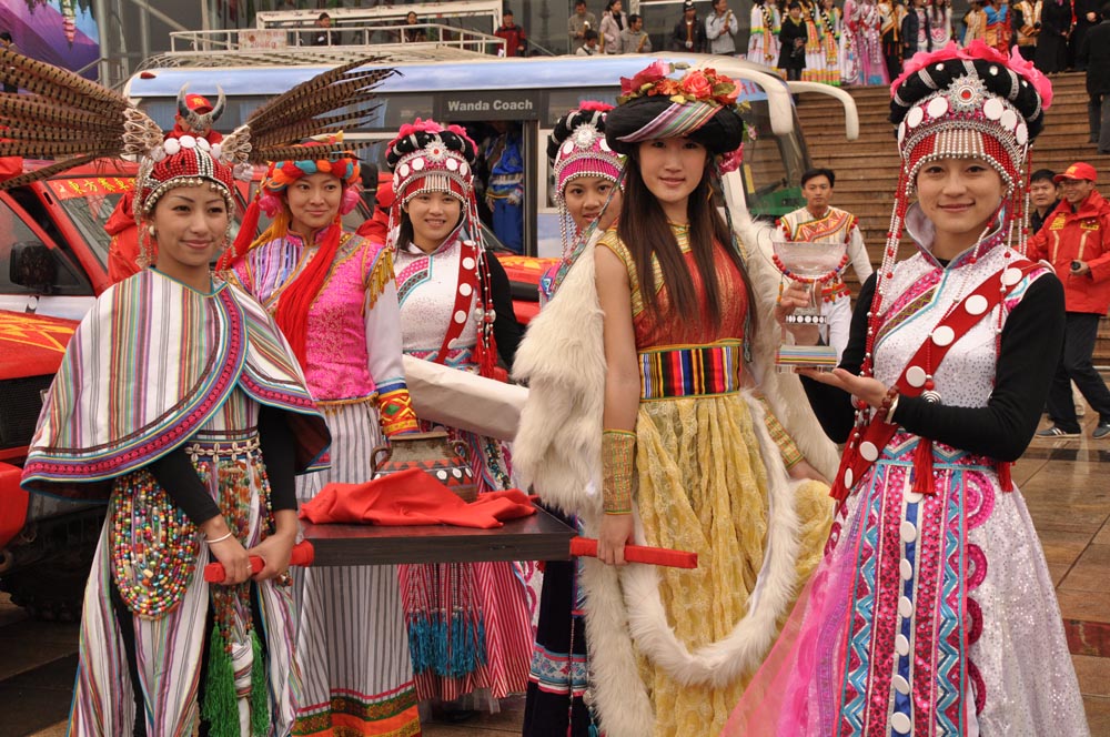 圖:同心酒罐及酒杯在傈僳族姑娘的簇擁下,將由昆明出發至怒江(劉寅攝)