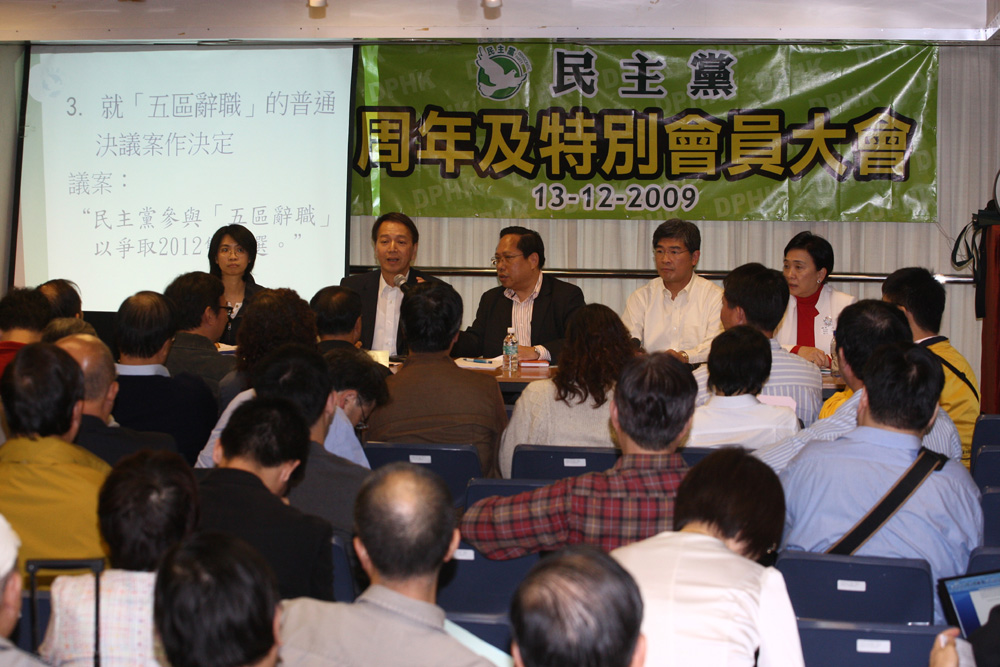 經過四小時辯論、近六十人發言後,民主黨最終以二百二十九票反對、五十四票支持,否決有關動議;其後有黨員提出修訂動議,要求就民主黨是否參加五區辭職、以「變相公投」方式爭取真普選和取消功能組別進行表決,再以二百一十五票反對、六十八票贊成和一票棄權被否決。民主黨主席何俊仁宣布,中委會決定不會以黨名義五區「總辭」,如果黨員要為個別候選人助選,只能以個人名義。