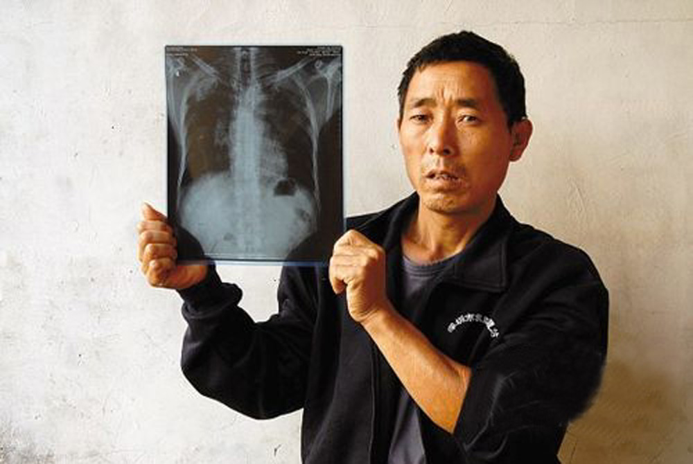 圖:谷臣光手持胸肺X光片,X光片顯示肺部一部分已經鈣化嚴重(網絡圖片)