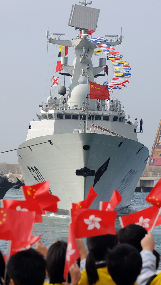 在索馬里亞丁灣完成護航任務的兩艘護衛艦,在五個月的工作後回歸久違的祖國,迎着維港的和煦海風,在昨晨十時許緩緩駛入解放軍駐港部隊昂船洲軍營碼頭。八百多位艦員身穿白色軍服及迷彩戰衣,在甲板分區列隊。大批小學生揮舞五星紅旗和特區區旗,在碼頭上歡迎遠道而來的海軍護航官兵。