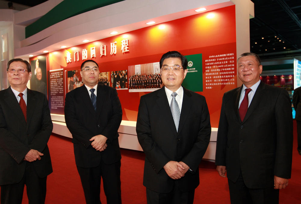 圖:中共中央總書記、國家主席、中央軍委主席胡錦濤(中)將於本周末訪問澳門。圖為本月十一日在北京首都博物館參觀澳門特區十周年成就展 (資料照片)