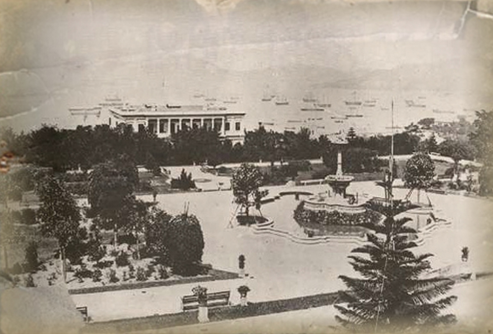 圖:19世紀的動植物公園,前身原是港督府的後花園。圖中噴水池對出的西式建築就是早期的港督府,在公園內還可盡覽維港景色