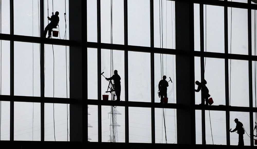 武廣高速鐵路客運專線將於二十六日正式開通運營,武廣高鐵的起點站──武漢火車站主體工程目前基本完工,各項配套工程正加緊施工。圖為十九日,工人正在清潔武漢火車站玻璃幕牆。