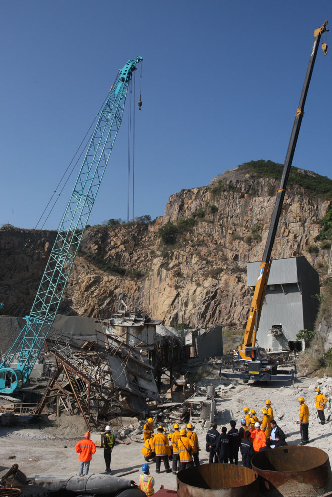 □秀茂坪安達臣道一個已停產的石礦場昨日發生奪命工業意外。三名工人在鐵架工作台拆卸巨型碎石機時,工作台突然倒塌,三人無法走避,從高處墮下,其中一人被壓在工作台下手腳骨折重創,由消防員救出送院後不治,釀成一死兩傷。\本報記者 梁衍衡