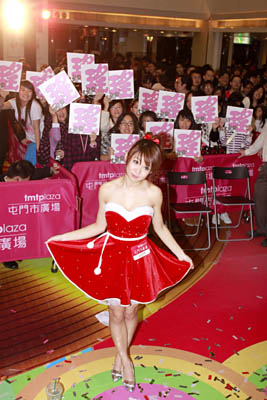 瑤瑤以性感聖誕女郎造型出現,可能服裝不合身,只見她不時拉住裙子,以防走光。瑤瑤今次與粉絲抱抱,不論男女老幼都抱,但粉絲們也好守規矩。瑤瑤原來是首次以聖誕女郎打扮出現,她覺得好特別。今年亦是她首度在港過聖誕,她覺得香港聖誕氣氛濃厚,在機場已見有聖誕老人派糖果,周圍亦有很多燈飾。但她還未收到聖誕禮物,她最希望可以收到卡,因為易於收藏。以前曾在聖誕收過男友送的 朱古力。