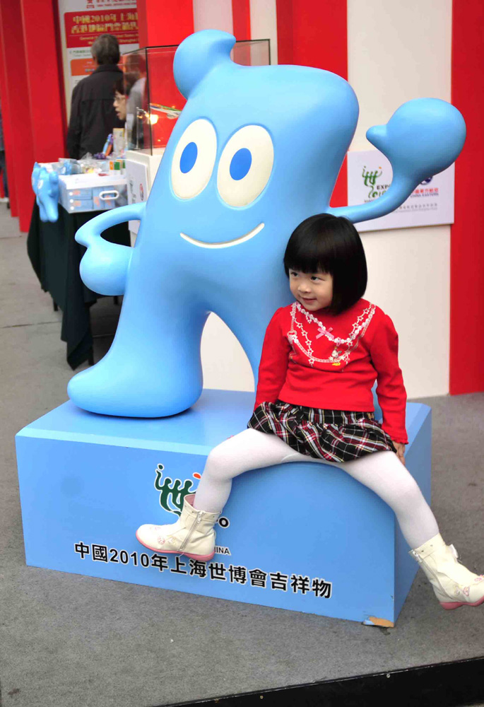 圖:上海世博門票在港至今已售出三萬張,世博會吉祥物「海寶」工展會內展出,受到小朋友歡迎 (中新社)