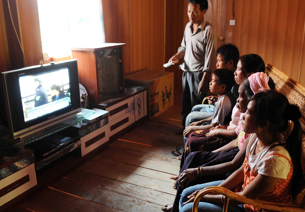 圖:克木人岩利(站立者)與家人在看電視(新華社)