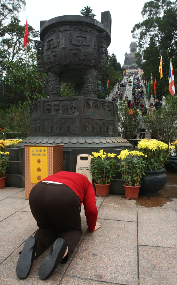 有虔誠的善信冒着嚴寒天氣,前往大嶼山,在通往天壇大佛陡長樓梯前面的寶鼎,恭恭敬敬地叩頭跪拜,祈求新一年能有一番新景象。縱然寶鼎內沒有香火,仍然不減善信的虔誠。寧謐祥和的環境,正襯托着善信的一片神心。