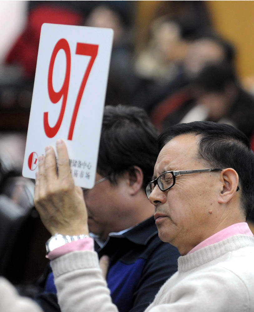 圖:在北京市土地整理儲備中心,一名發展商代表為拿到好地,忍「痛」舉牌競價(新華社)