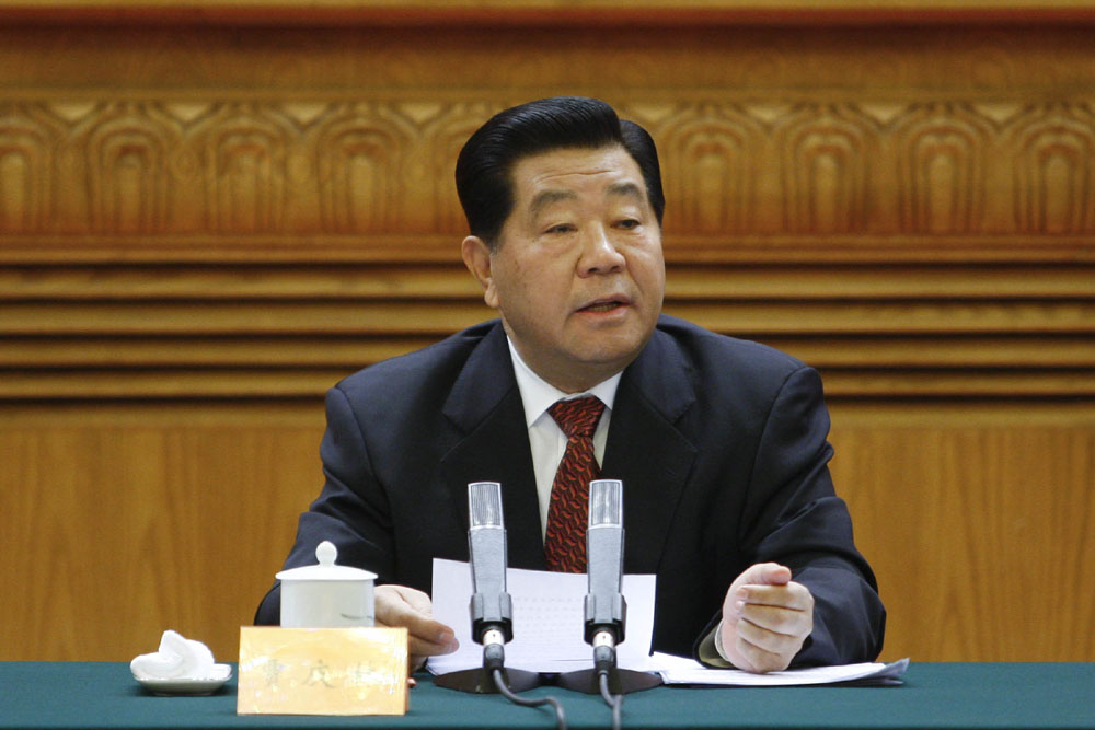 圖:北京各界三十日在人民大會堂集會,座談胡錦濤對台重要講話發表一周年。中共中央政治局常委、全國政協主席賈慶林出席座談會並發表講話(中新社)