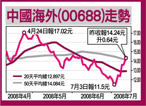 中國海外(00688)剛公布6月份實現房地產銷售額上升205%至45.6億,而銷售面積亦上升165%至50.2萬平方米。今年首半年的累計實現銷售額上升84.9%至158億,而銷售面積上升58%至147萬平方米,數據反映出集團樓盤銷售狀況並未受宏調打擊。有一點值得留意是銷售額增幅遠高於銷售量,反映出集團並未有透過減價促銷,故毛利率應可維持高水平。另外,集團08年全年收入已有近90%鎖定,故風險為同業中最低,而現金流則最強。目標16元,止蝕12.8元。