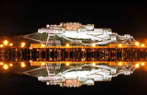 暑期的拉薩夜晚,高大宏偉的布達拉宮古建築,在十幾盞巨大燈光的照耀下更顯壯觀而神奇。新改建的布達拉宮廣場,樂聲陣陣,噴泉迭起,各色燈光巧妙地把草坪、綠樹、垂柳裝點得似人間仙境,讓遊客和市民們遊樂其中,流連忘返。(中新社)