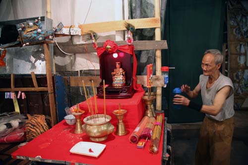 戲班每次演出,必定在後台放道具的地方設置神壇,供戲班人士拜祭。神壇只安放一尊華光神像(原是火神,傳說拯救戲班子弟免於火厄),但其身後還寫上其他神靈的名字,包括田竇二師(武打和歌舞之祖師)、張騫先師(南派武功的開山祖)和譚公(吹彈樂器之祖師),一起接受供奉。