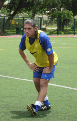 圖:森姆迪奧做足熱身運動,迎接在港第一次操練  (本報攝)