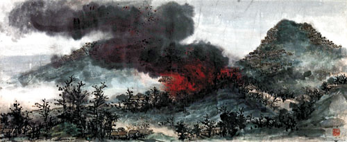 黃般若的《九龍火舌圖》以一九五三年石硤尾木屋大火為題,畫中烈焰熊熊,濃煙沖天之景象,早已打破傳統山水的格局,畫家以其佛像畫中的煙雲火焰,轉化為現實火災情景。