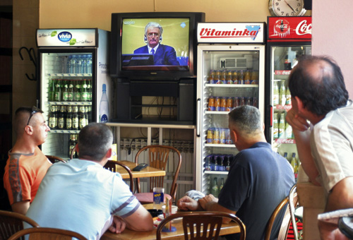 圖:波斯尼亞塞族居民七月三十一日觀看卡拉季奇出庭的電視新聞(美聯社)