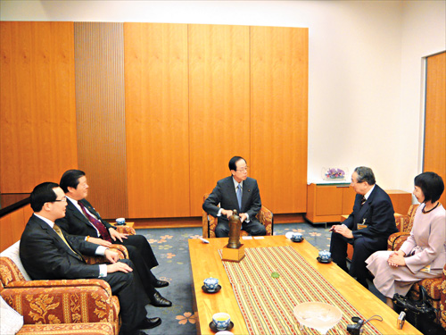 圖:福田首相與湯恩佳院長、許智明主席、西原春夫教授以及王敏教授親切交談