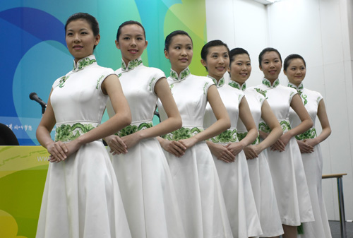禮服共分長裙和及膝裙兩款。在頒獎典禮期間,身穿席地魚尾長裙、腰間繫上玉佩的禮儀小姐將負責引領嘉賓進場;而由於頒獎儀式將在沙地上進行,因此負責引領運動員和頒獎的禮儀小姐將穿上及膝裙(北京奧運頒獎儀式上引領嘉賓和運動員的禮儀小姐全部着長裙)。其餘負責運送金、銀、銅牌到頒獎嘉賓手上的禮儀小姐將全部着及膝裙。而禮儀小姐的頭髮則全部需要盤起來呈如意結的形狀。