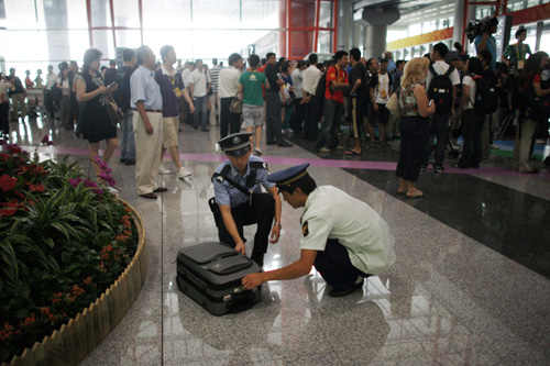 圖:四日,北京機場發現一個無主旅行箱,警察立即進行檢查(路透社)