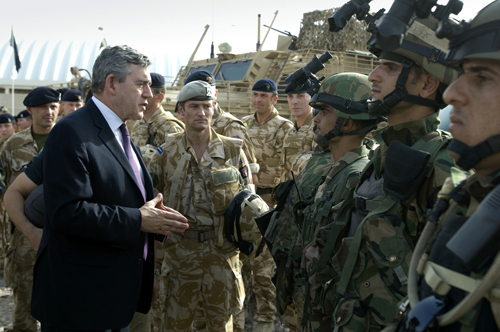 圖:英國首相白高敦(左)七月十九日到伊拉克巴士拉視察英軍(美聯社)