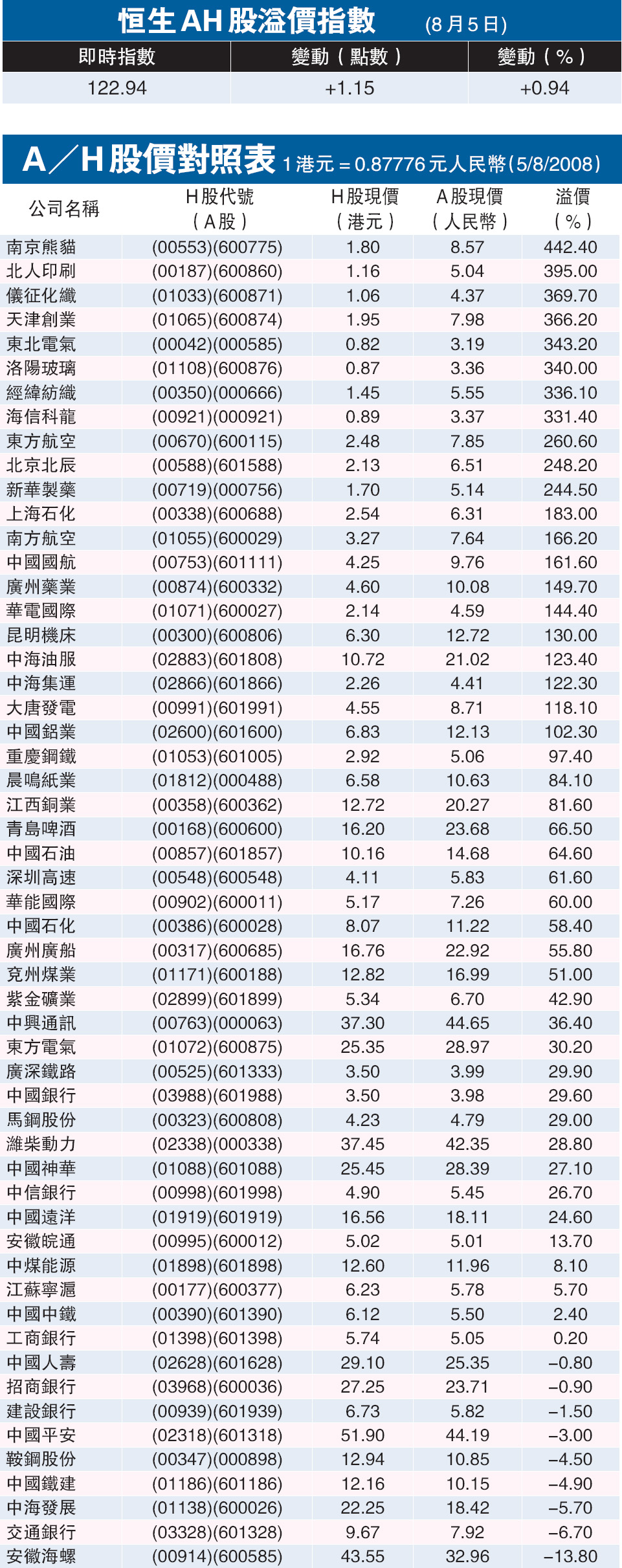 恒生AH股溢價指數