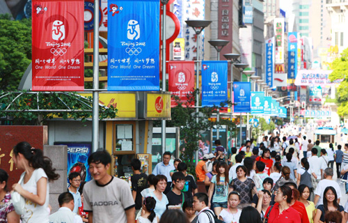 圖:北京奧運會開幕在即,上海市街頭充滿各式各樣的奧運元素,讓市民感受到濃濃的奧運氣氛(新華社)