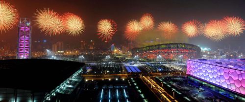 圖:奧運會在北京開幕,「鳥巢」周邊綻放絢麗煙花(新華社)