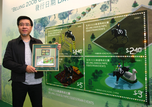 圖:設計師余志光和他設計的「北京2008奧運馬術比賽」特別郵票合影(本報攝)