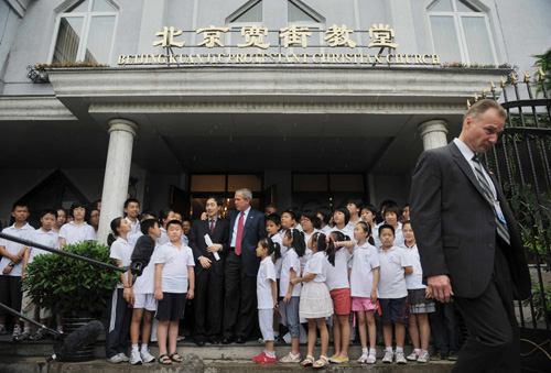 圖:美國總統布什10日在北京寬街教堂做禮拜後與教徒合影(法新社)