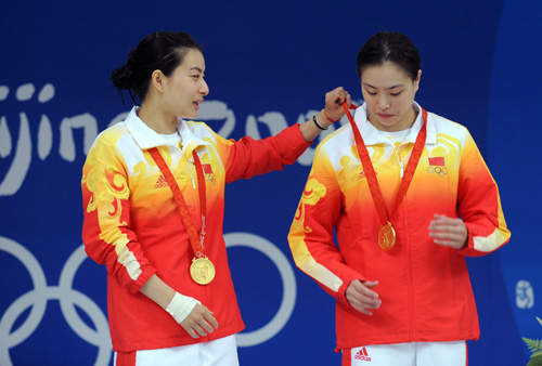 圖:郭晶晶(左)、吳敏霞昨天再度合作摘下女子雙人3米板金牌,頒獎時郭替吳整理綬帶,透出點點姊妹情(新華社)