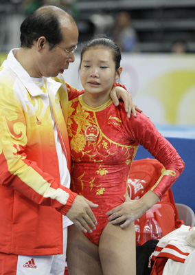 程菲是17日中國女隊寄望最殷的選手,她在奧運跳馬和自由體操預賽中均排名第1,是2個項目奪冠呼聲最高的選手。可惜,決賽中她的表現與預賽判若兩人,並出現了意外失誤。賽後,程菲禁不住流下傷心的淚水,國家隊體操女隊主教練陸善真則不停地安慰她。