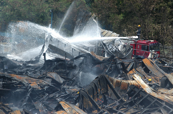 【本報訊】記者俞凱穎報道:消防員用化學泡沫及射水灌救五個多小時,終將大埔工業邨廢棄車胎回收廠的四級大火撲熄,二百多平方米的鋅鐵廠房完全燒塌仿如廢墟。負責統籌撲火的新界北副消防總長身先士卒,一度不適要即場接受救治。工人逃命時不忘將看門狗鬆綁,但狗隻沒有逃遠留守火場附近,工人昨晨返回將它接走。